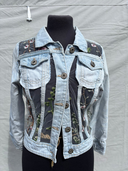 Ask about a custom jacket just for youLadies Denim Jacket with Embroidered Sheer Mesh Lace Panels