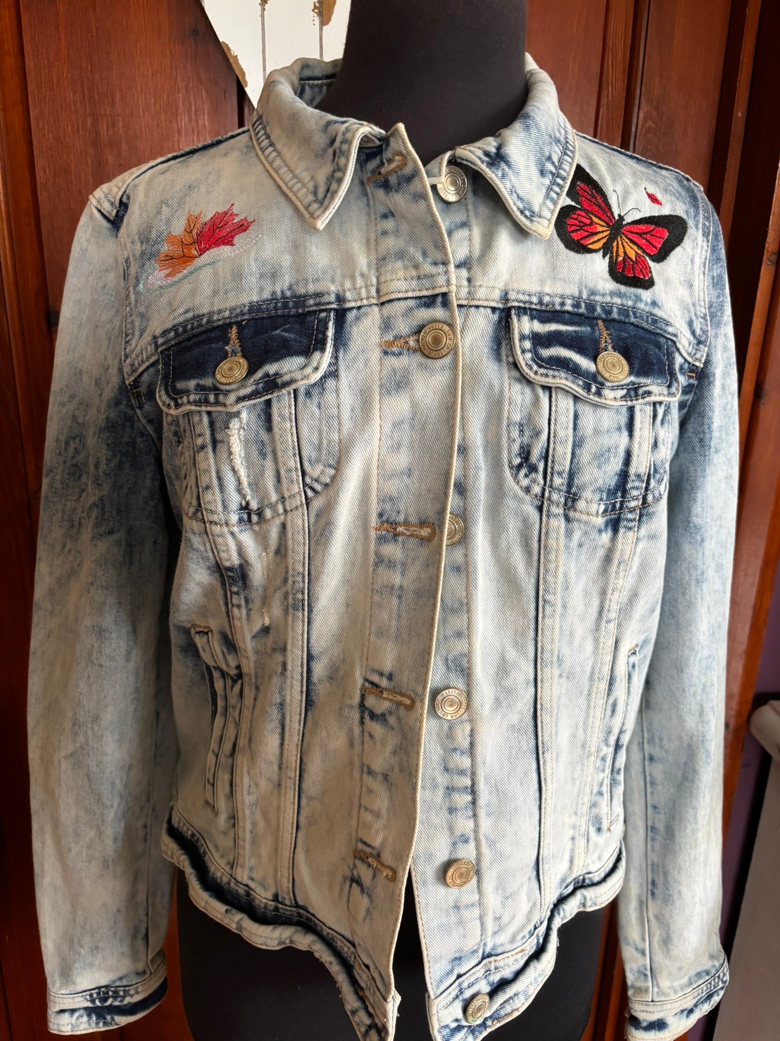 Bleached Denim jacket embroidered with autumn leaves and butterflies