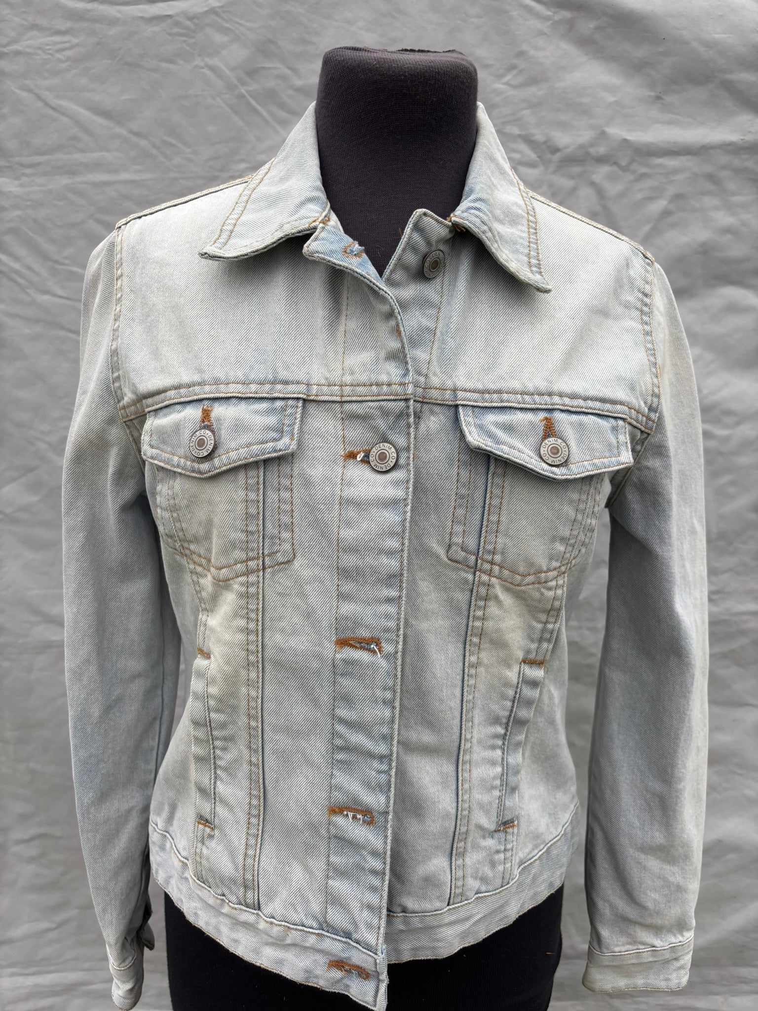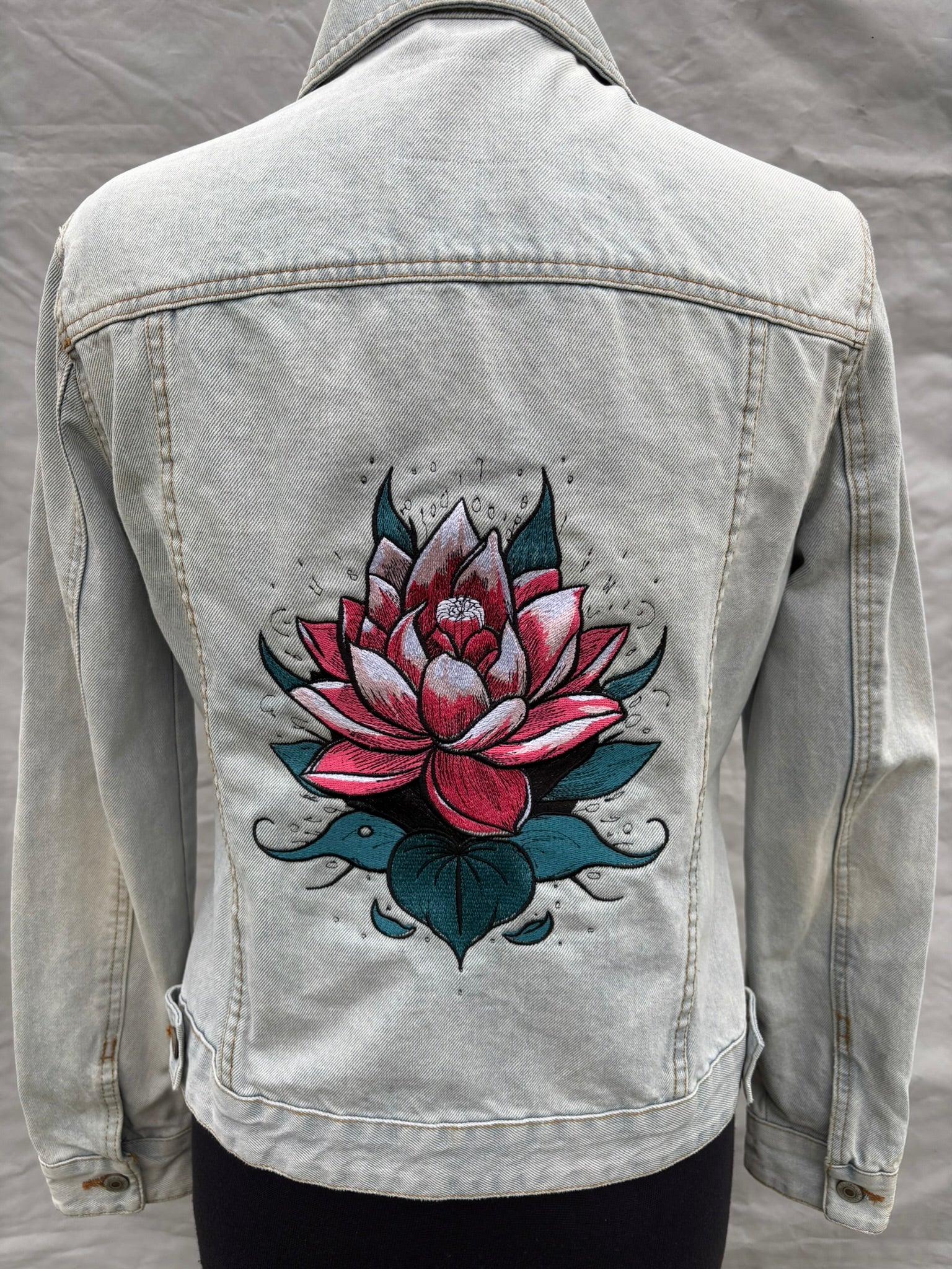 Beautiful, enormous lotus flower embroidered on the back of a faded denim jacket